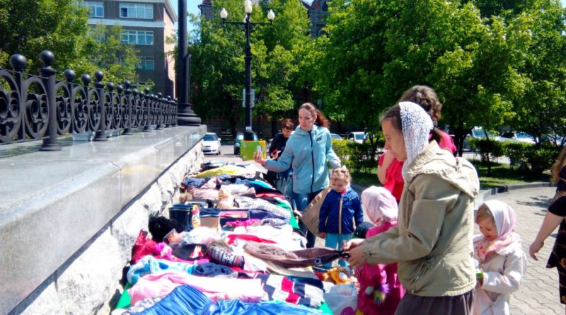 4 июня в праздник Святой Троицы у Градо-Хабаровского собора Успения Божией Матери прошла благотворительная ярмарка «Из рук в руки», организованная приходским клубом многодетных семей «Ландыши».