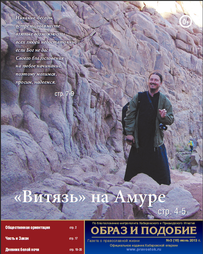 Вышел в свет июньский номер епархиальной газеты "Образ и подобие". Издание начинает разговор с читателем с информации о прошедшем круглом столе в Хабаровской семинарии при участии ряда общественых организаций края, посвященном теме сохранения нравственных устоев общества. Главным материалом номера является интервью настоятеля храма Преображения Господня в г. Охотске, иеромонаха Викентия (Романюка). Издание знакомит читателей с последними событиями из жизни епархии, а также предлагает авторский комментарий на недавние законодательные иницитивы и некоторые общественные явления касающиеся жизни верующих.