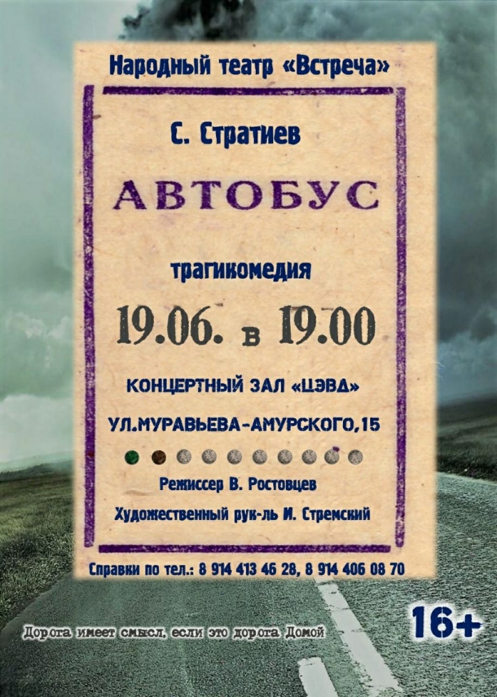 — Осталось всего несколько дней до премьеры и коллектив театра работает с большим напряжением. Не скрою, волнение есть. Для нас работа над серьезным драматургическим материалом — это новый уровень, новая ступенька в развитии коллектива, — рассказывает о том, что ждет зрителя, художественный руководитель коллектива Иван Стремский. — Захотелось попробовать свои силы в серьезной, полновесной драматургии. И, как мне кажется, пьеса «Автобус» болгарского драматурга Станислава Стратиева вполне отвечает этим требованиям. Она была написана в 80-е годы теперь уже прошлого столетия. Были немногочисленные ее постановки в театрах западной части России, зритель Дальнего Востока ее не знает.