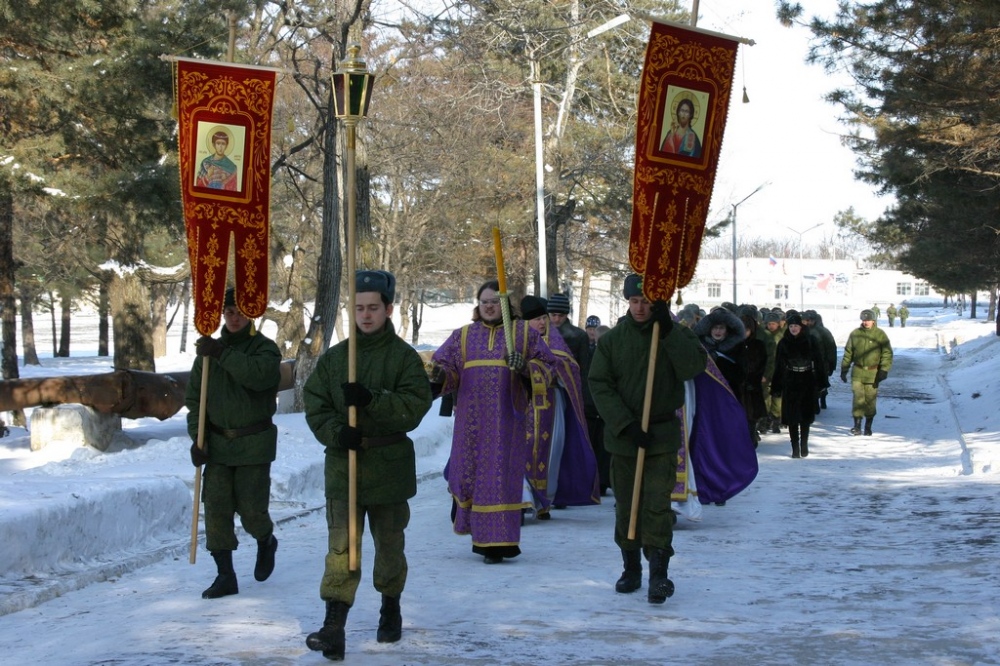 По окончании Литургии, поклонившись Кресту, мы отправились в крестный ход по войсковой части. Сильный ветер и мороз немного испугал собравшихся на улице, но только не наших отцов. С молитвой Господу и великомученику Димитрию Солунскому, небесному покровителю полка, все двинулись в путь. Крестным ходом обошли территорию полка и вернулись в храм. Там о. Владимир в заключение своей проповеди сказал замечательные слова, которые запомнились всем присутствующим: «Не форма делает воина воином, а состояние его души».