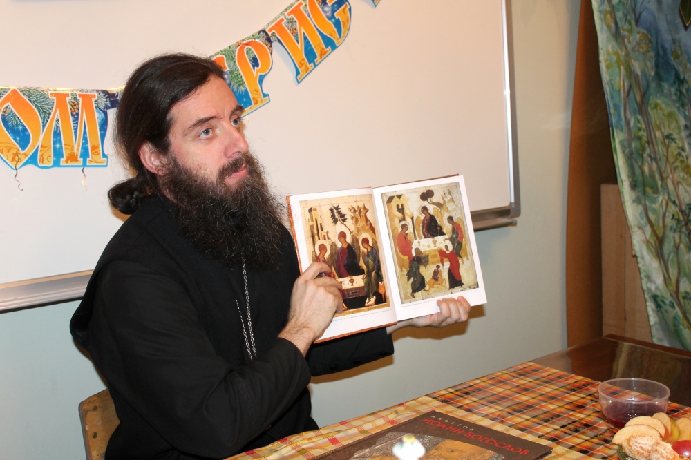 В минувший четверг состоялась одна из таких «внеучебных» встреч, на которую, по приглашению будущих иконописцев, пришел иерей Евгений Веселов. Батюшка неплохо знаком с иконописью — его супруга занимается реставрацией.