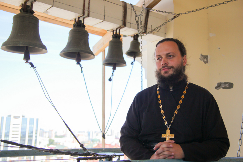 Далее студентов ждала экскурсия по главному храму города. Ребят из КНР впечатлили размеры Спасо-Преображенского кафедрального собора - его высота куполов с крестами составляет 96 метров. Они не без труда преодолели 211 ступенек, чтобы подняться на звонницу храма. Там их ждал завораживающий вид на Хабаровск, а также небольшой мастер-класс по колокольному звону.