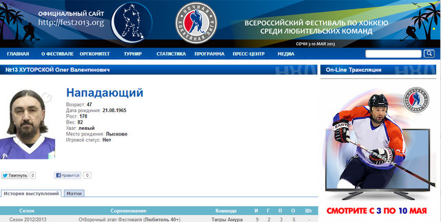 С 3 по 10 мая 2013 г. в Сочи состоится II Всероссийский фестиваль по хоккею среди любительских команд. В турнире будут принимать участие и любительские команды из Хабаровского края. В состав хоккейной команды «Тигры Амура» вошёл священнослужитель – протоиерей Олег Хуторской, епархиальный секретарь, настоятель храма святителя Иннокентия Иркутского г. Хабаровска. В команде протоиерей Олег играет в качестве нападающего под 13 номером.