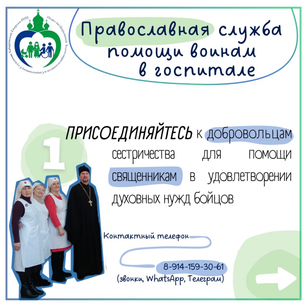 Хабаровские священники регулярно посещают госпиталь, совершают Таинство Крещения, Покаяния, Евхаристии. Это важные события в жизни христианина. С февраля 2025 года для помощи священникам стала действовать православная служба помощи воинам, куда входят добровольцы и сестры милосердия Свято-Елизаветинского сестричества милосердия.