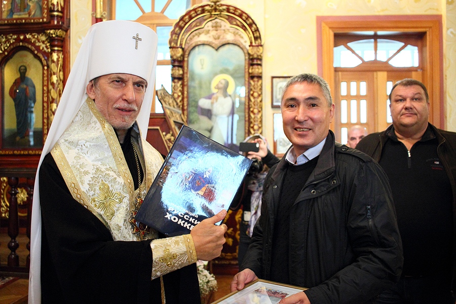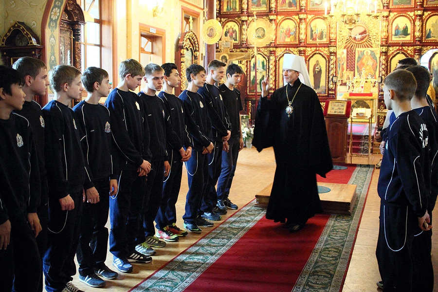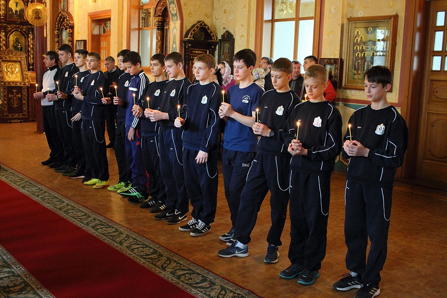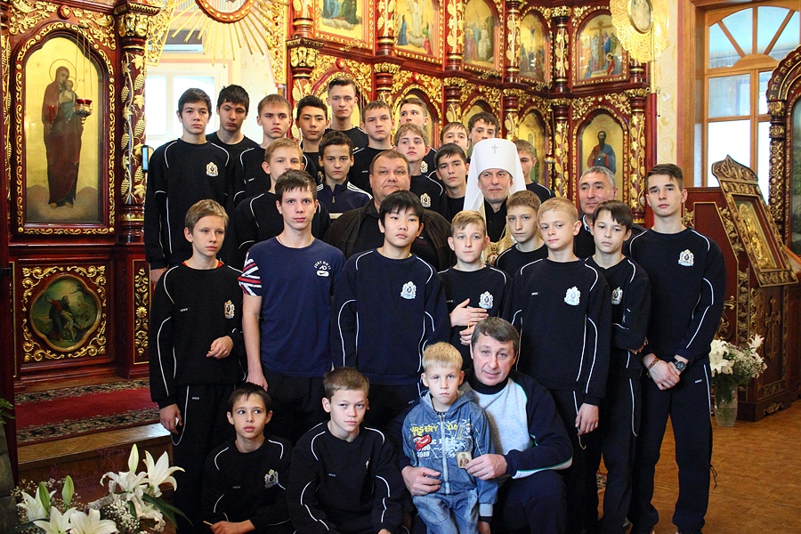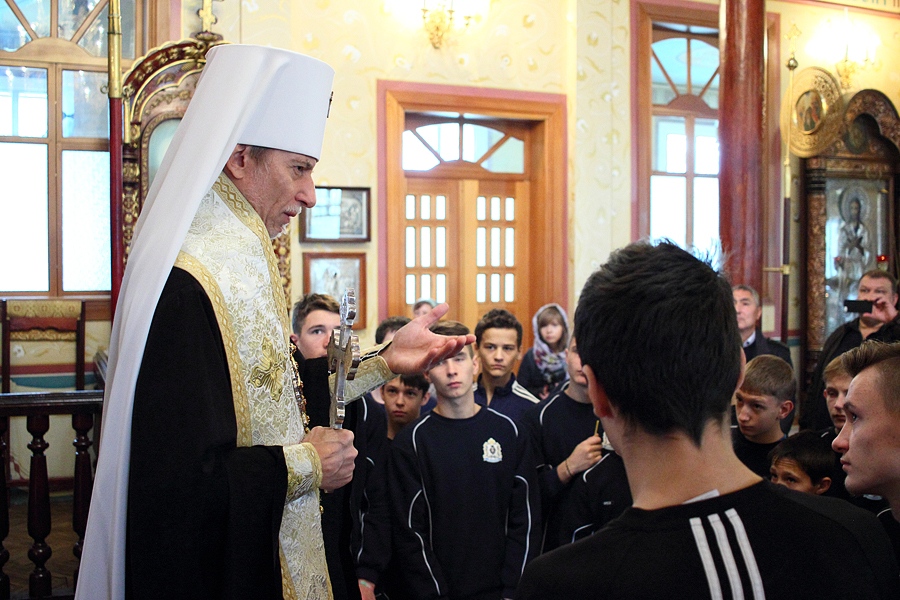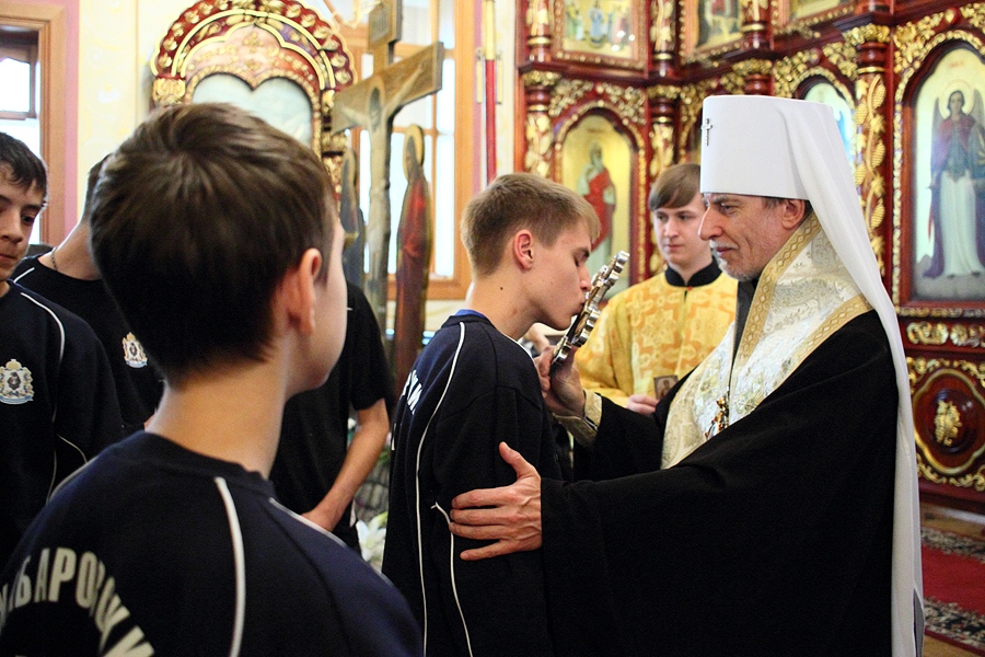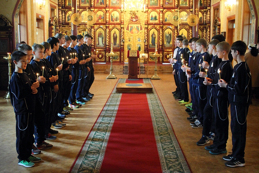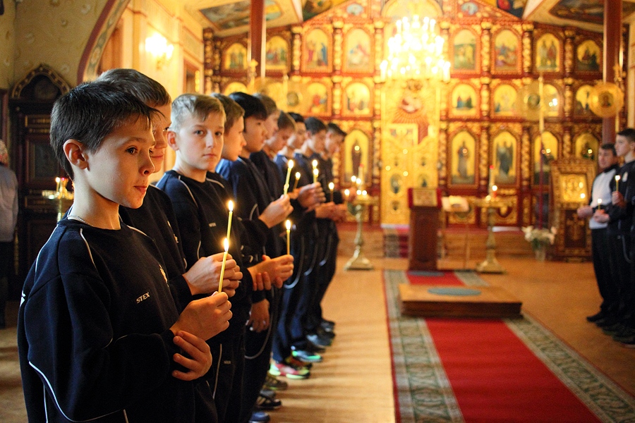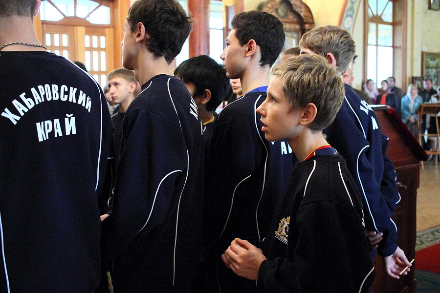 Молебен в Христорождественском соборе Хабаровска с игроками и тренерами юношеской сборной края по хоккею с мячом. 17 октября 2015 года