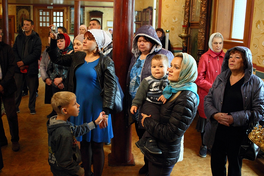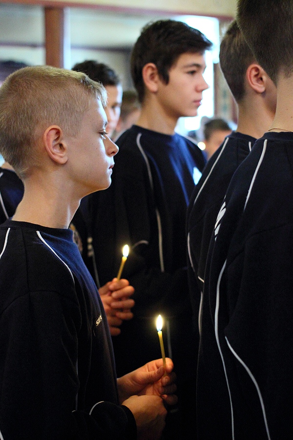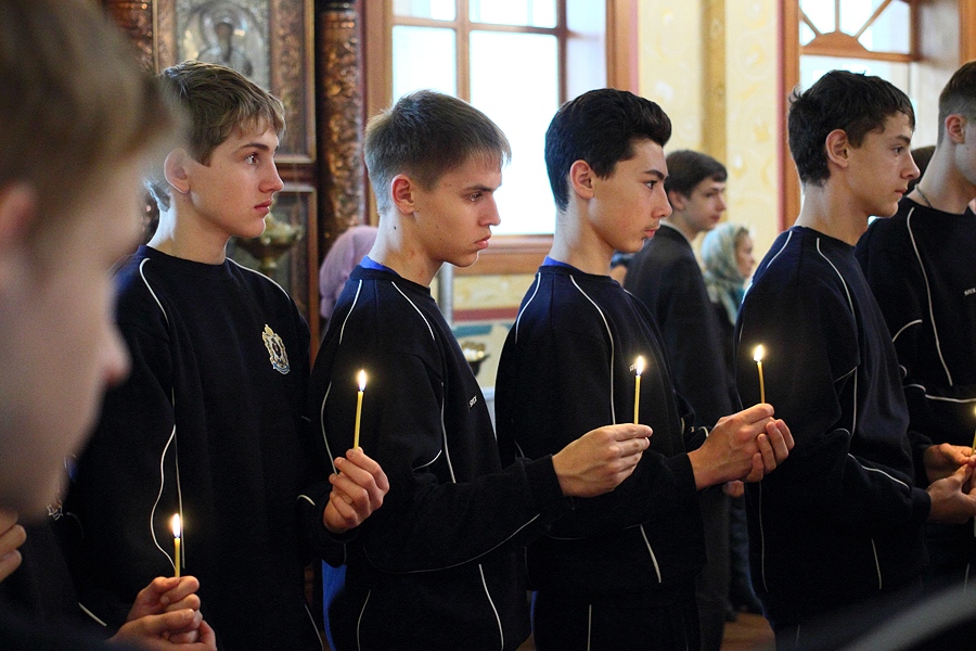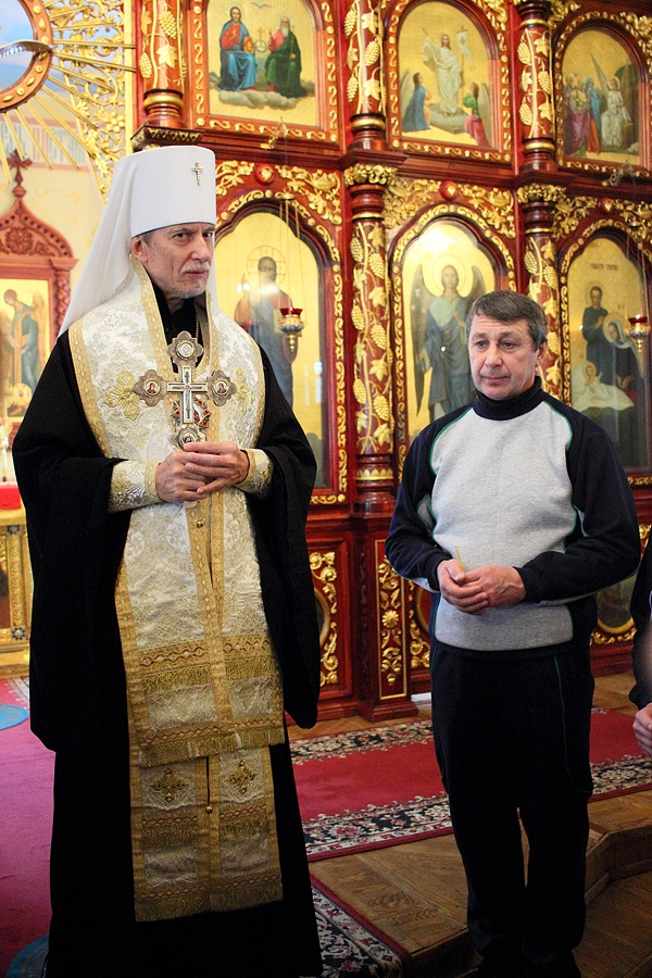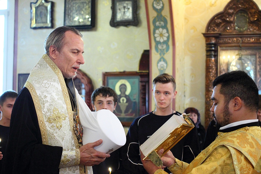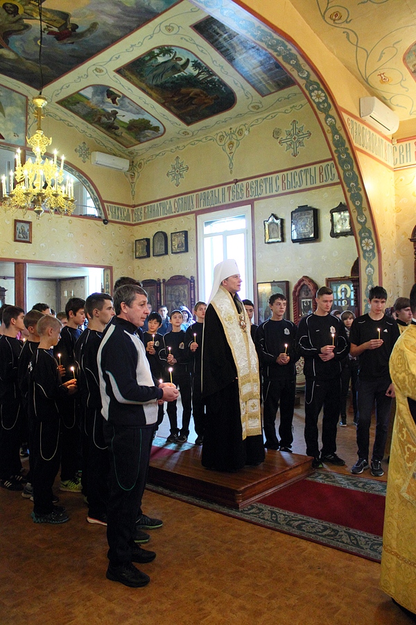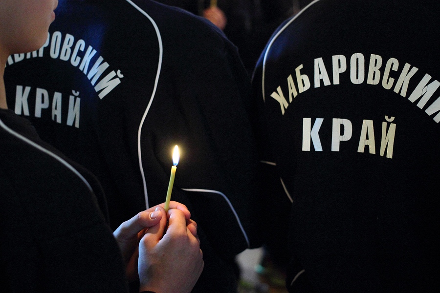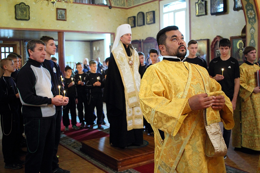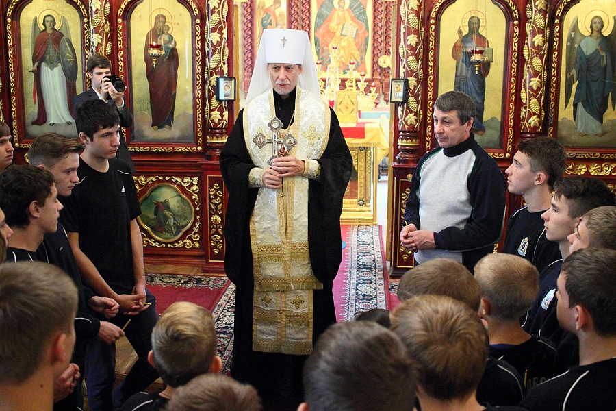 Молебен в Христорождественском соборе Хабаровска с игроками и тренерами юношеской сборной края по хоккею с мячом. 17 октября 2015 года